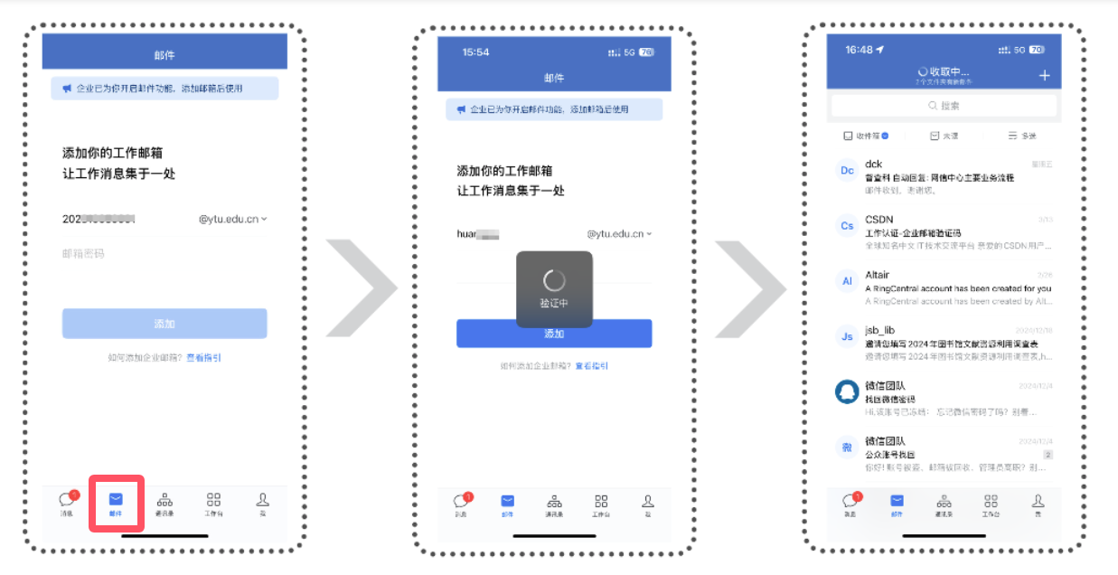 企业微信首页点击“邮件”,在添加账户页面输入邮箱账号(系统默认校园卡号为邮箱前缀,请更改为准确的邮箱前缀)及邮箱密码,点击“添加”,验证通过即可添加成功。邮箱后缀默认教职工为@ytu.edu.cn,学生为@s.ytu.edu.cn。