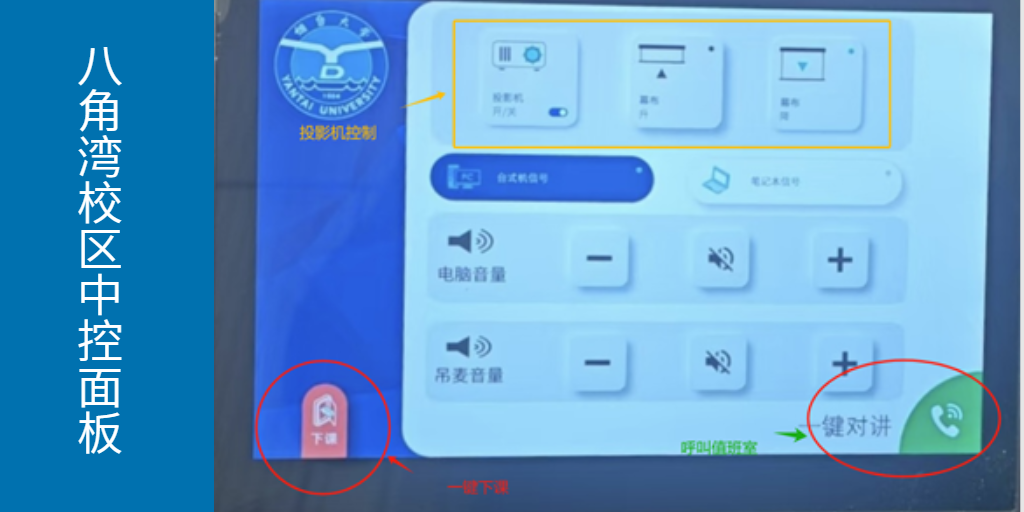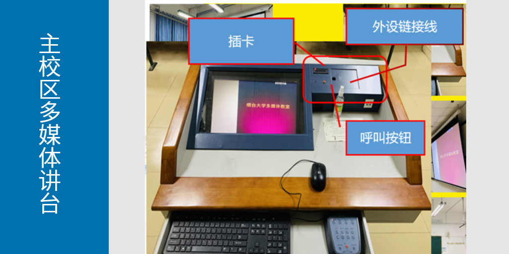 2.上课过程中请保持校园卡插在读卡器中(请勿频繁插拔校园卡。设备启动需要时间,若拔卡后想再次使用设备,请等待中控面板恢复至烟台大学图标后再插入校园卡)。