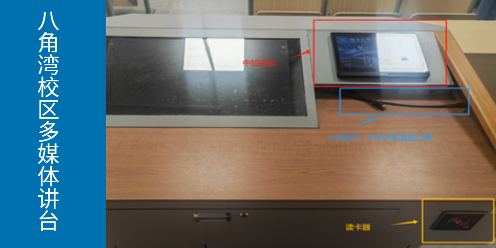 上课:拉出抽屉取出鼠标,将校园卡插入读卡器,所有设备自动开启(图4)。